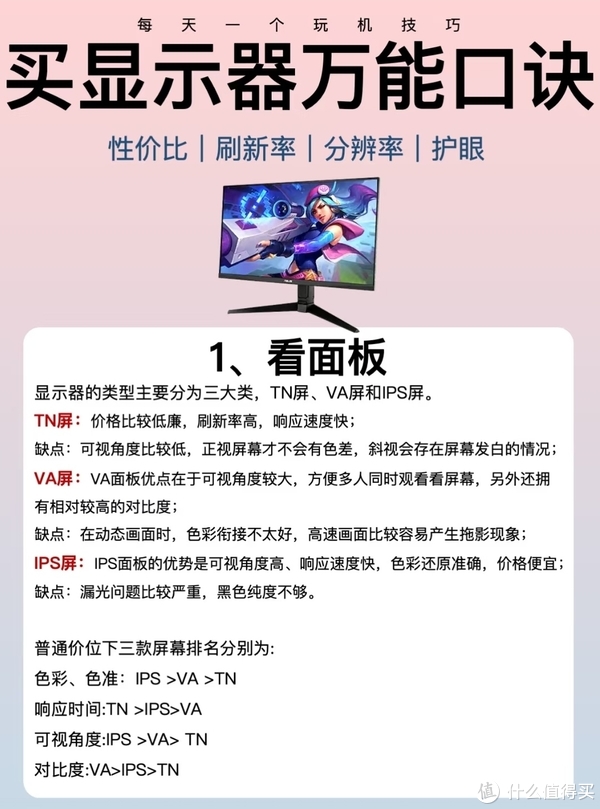 首先,咱们得看面板类型。IPS、VA、TN三种面板,各有优劣。想要色彩鲜艳、可视角度大,选IPS;追求对比度和暗部细节,VA是你的菜;如果只玩电竞,追求极限响应速度,TN也能凑合。记住,IPS > VA > TN,这是色彩和视角的基本规律。