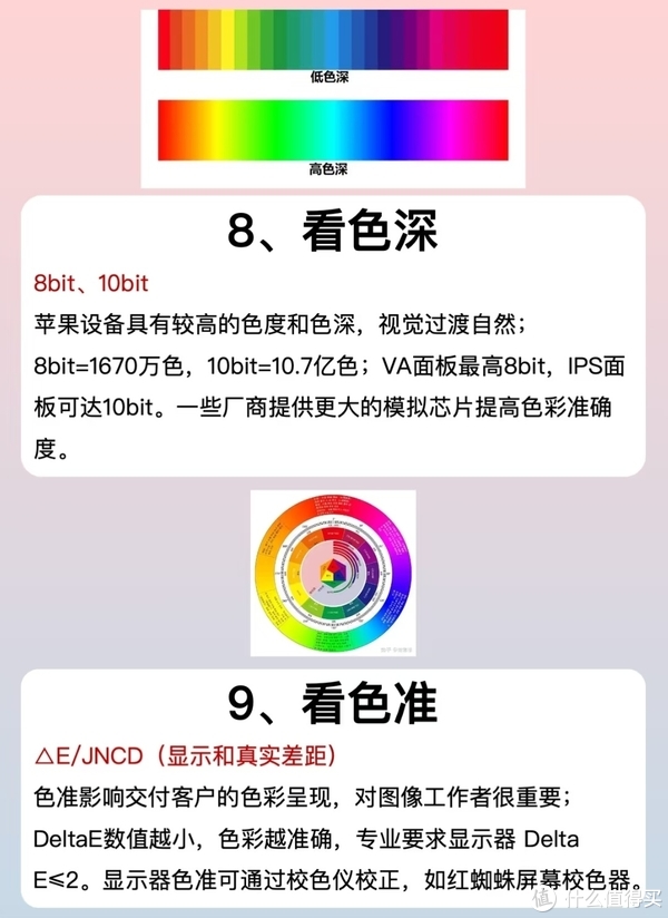 色深越高,色彩过渡越自然。8bit够用,10bit则是专业级别。IPS面板可以达到10bit,VA面板一般是8bit。