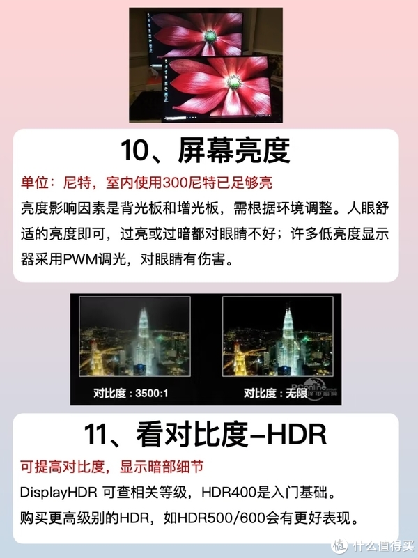 亮度不是越高越好,室内300尼特足够。别让过亮或过暗的屏幕伤害你的眼睛。PWM调光要不得,尽量选择无闪烁的显示器。
